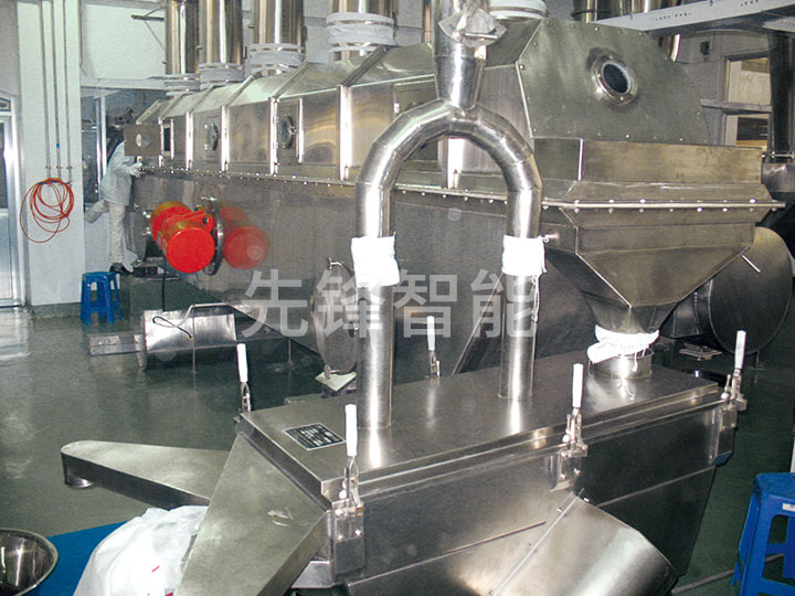 物料自進料進口進入機內,在振動力作用下,物料沿水平面流化床拋擲,向前連續運動,熱風向上穿過流化床同濕物料換熱后,濕空氣經旋風分離器除塵后由排風1:3排出.干燥物料由排料進口排出。