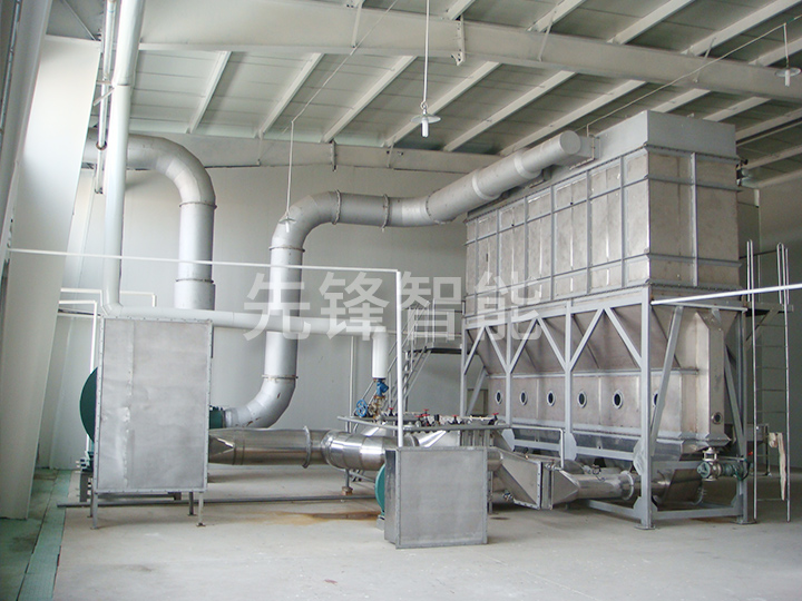散粒狀固體物料由加料器加入流化床干燥器中,過濾后的潔凈空氣加熱后由鼓風機送入流化床底部經分布板與固體物料接觸,形成流態化達到氣固的熱質交換。物料干燥后由排料口排出,廢氣由沸騰床頂部排出經旋風除塵器組和布袋除塵器回收固體粉料后排空。